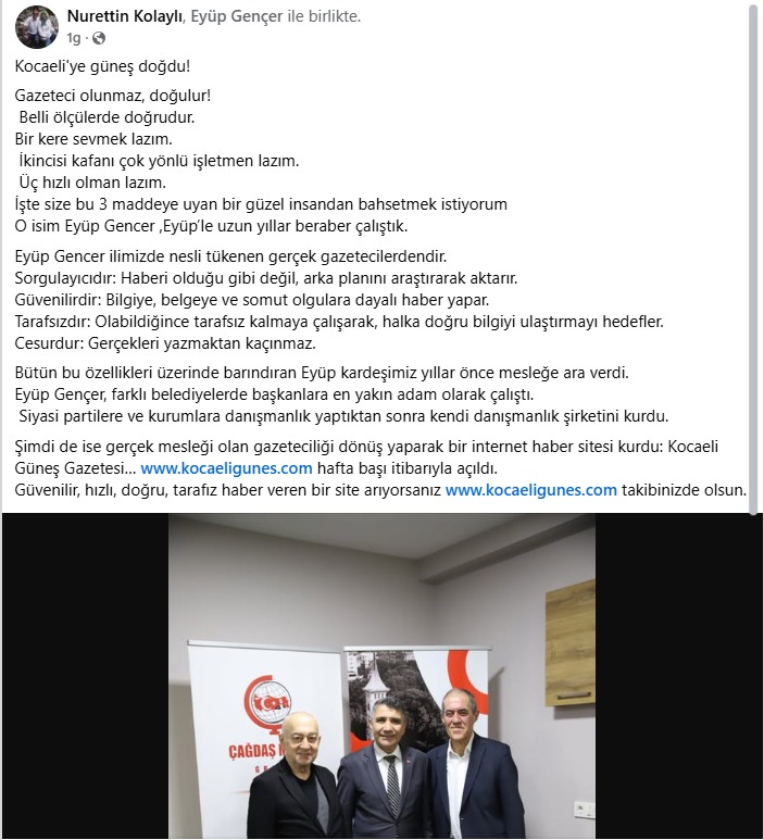 Nurettin Kolaylı bu mesleğin büyüklerinden duayenlerindendir. Söyledikleri bizim için büyük moral oldu. Kolaylı sosyal medya hesabında Kocaeli Güneş için şunları yazmış aktarıyoruz: