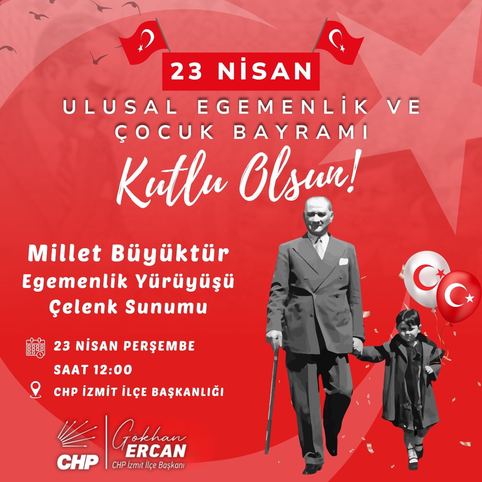 CHP İzmit İlçe Başkanlığı, 23 Nisan Ulusal Egemenlik ve Çocuk Bayramı kapsamında İzmit’te “Egemenlik Yürüyüşü ve Çelenk Sunumu” programı düzenleyecek